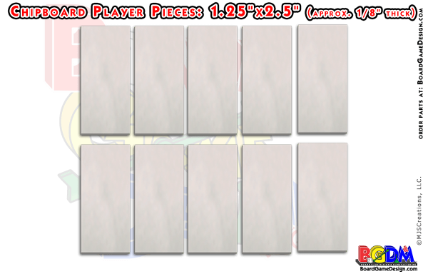 Each Measures 1.25″ Wide x 2.5″ (approx. 1/8” [0.125”] thick, 52 pt. chipboard). Make your own custom full color printed pieces/standees! With these Standee/blank Chipboard Player Pieces, print your artwork from your own printer, then cut and mount them onto each piece.
