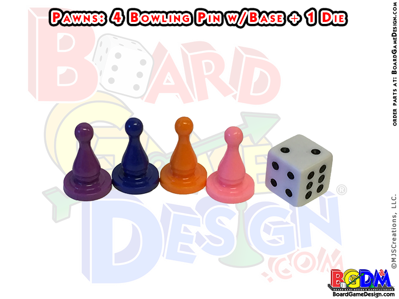 Bowling Pin Shaped Pawns with Base and Die: 4 Pawns + 1 Die (Bowling Pin w/Base: Blue, Orange, Pink, Purple; Die: white w/black dots, 16mm 6-sided)