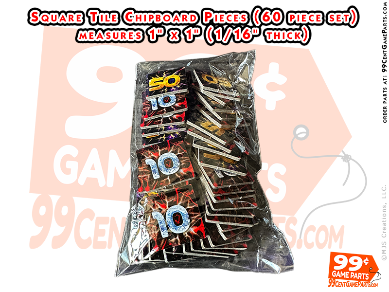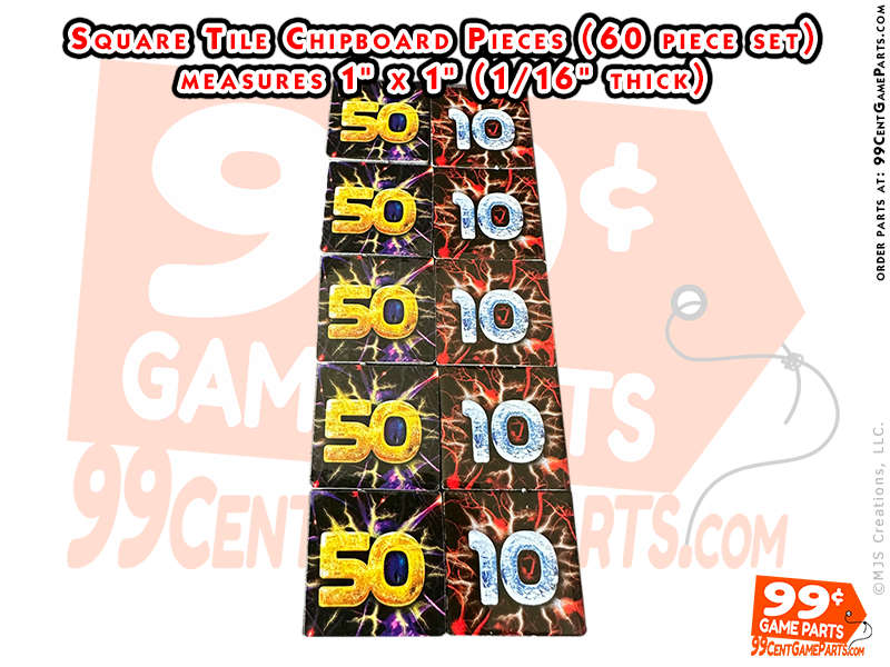 40 of the #10 pieces, and 20 of the #50 pieces. Each Measures 1″ x 1″ (approx. 1/16” thick chipboard). Use as is, Print your artwork from your own printer, then cut and mount them onto each piece to make your own custom full color printed game pieces!