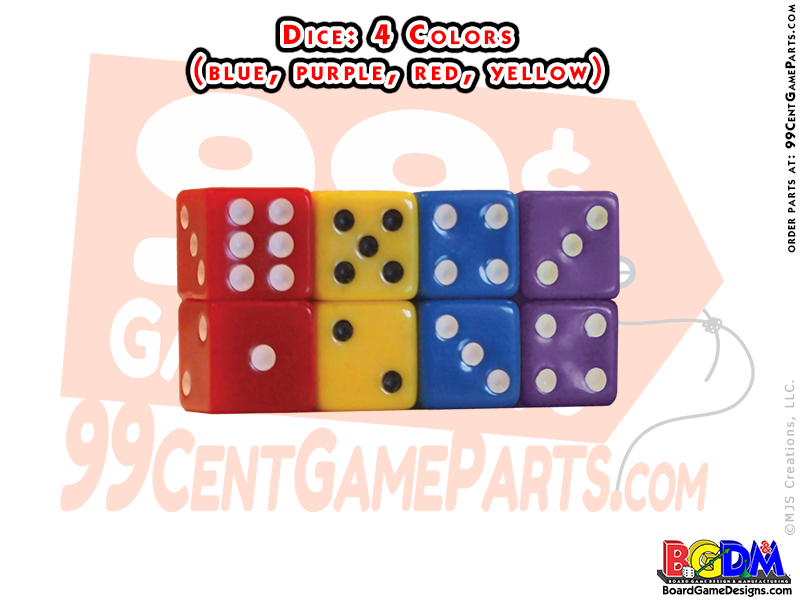 4 Dice Color Set is available in opaque colors. We carry these Dice Sets in the following colors: blue, purple, red, and yellow.