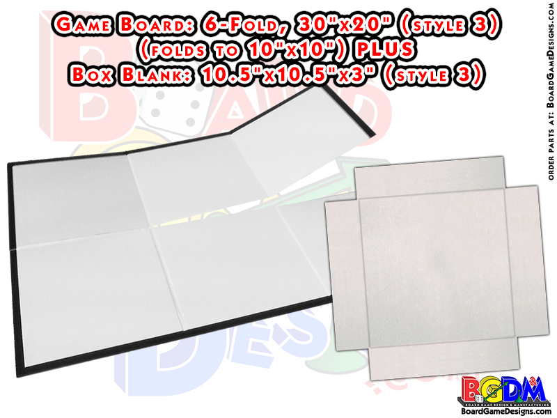 - Style 3 SIX-fold Game Board measures 30″x20″ folding to 10″x10″; comes with Style 3 Box 10.5″x10.5″x3″