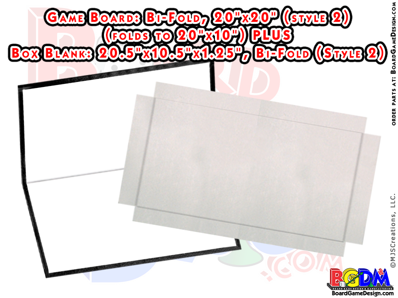 - Style 2 BI-fold Game Board measures 20″x20″ folding to 20″x10″; comes with Style 2 Box 20.5″x10.5″x1.25″