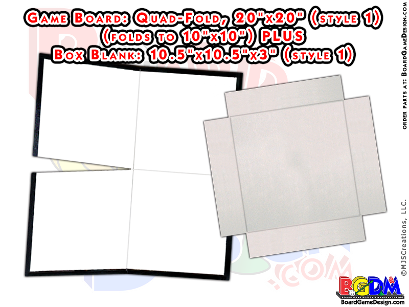 - Style 1 QUAD-fold Game Board measures 20″x20″ folding to 10″x10″; comes with Style 1 Box 10.5″x10.5″x3″