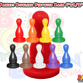 Pawns Bowling Pin Shaped with NO Base/Replacement Game Parts: 1″ high with a round 1/2″ diameter bottom (with no base). Available in solid colors: Black, Blue, Brown, Green, Orange, Pink, Purple, Red, White & Yellow.
