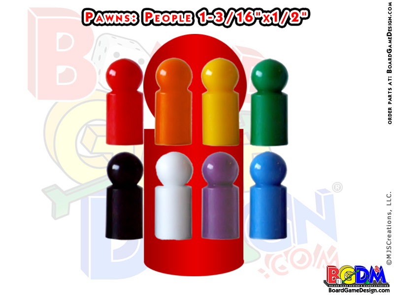PAWNS People Shaped 8 color set Replacement Game Parts: 1-3/16″ high with a round 1/2″ bottom. Available in solid colors: Black, Blue, Green, Orange, Purple, Red, White & Yellow.